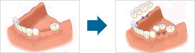 最近は抜歯予定の歯にもすぐにインプラントを行ったり、驚くほど早期に治療がおこなえるような場合が少なくありません。元あった歯のように、大きさや幅も自在に対応できます。他の治療方法と比べ病気の再発や失敗が少ないことが特徴です。
