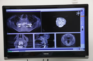 歯科用CTは、あごの骨を3次元の画像で処理できるため、神経の位置を把握したり、インプラントの植立、方向など念密な治療予測シュミレーションを行うことが可能です。
